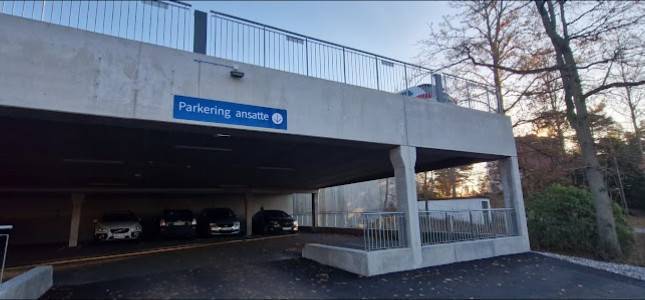 Flott parkeringshus, men nede under tak er kun for ansatte.